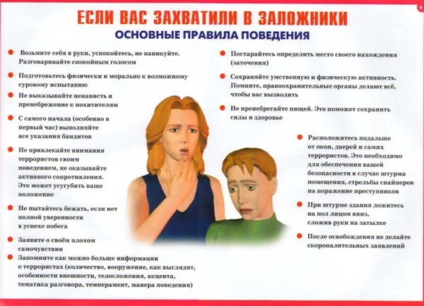 Если ты оказался в заложниках, знай - ты не один. Помни: опытные люди уже спешат к тебе на помощь. Не пытайся убежать, вырваться самостоятельно - террористы могут отреагировать агрессивно. Постарайся успокоиться и жди освобождения.